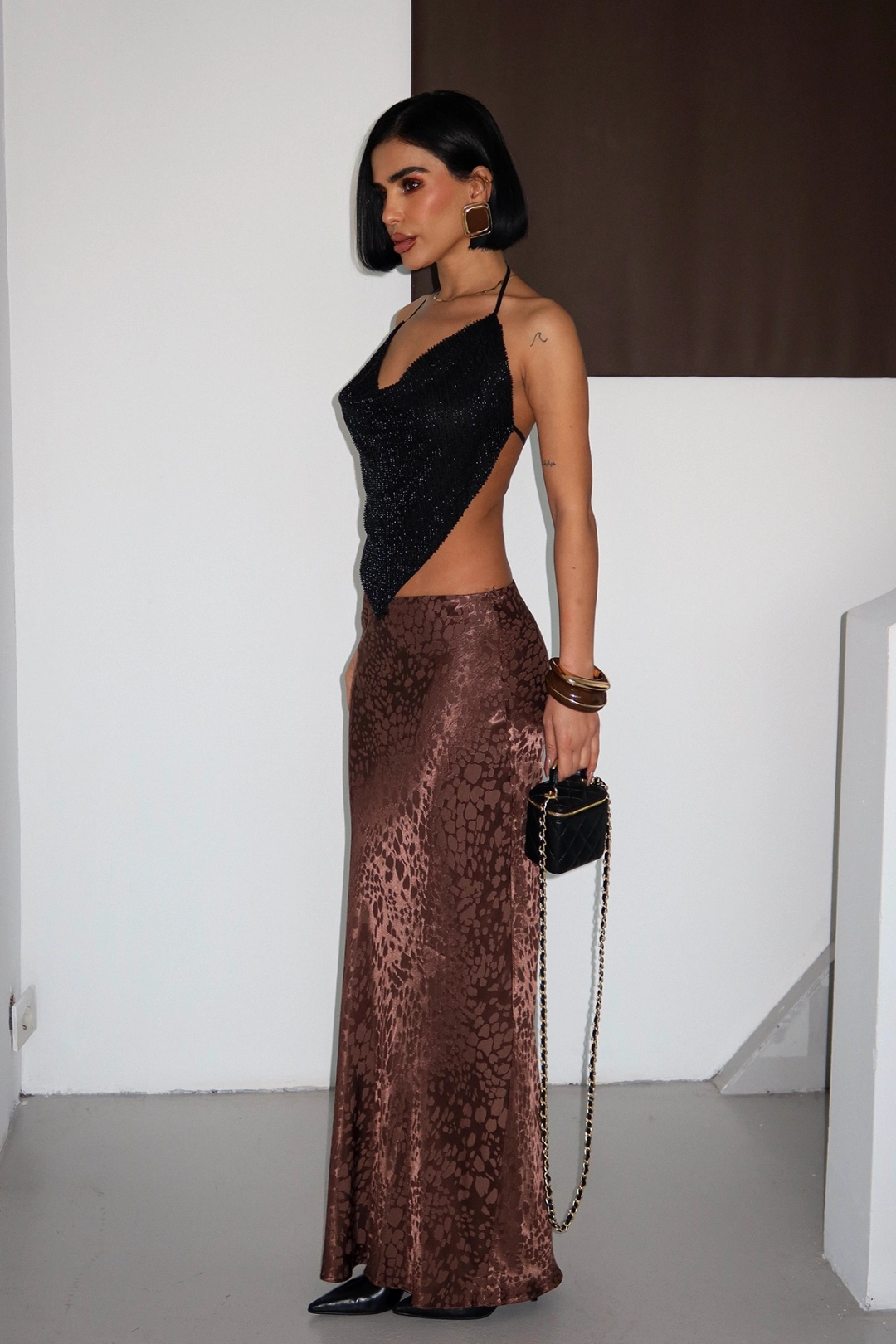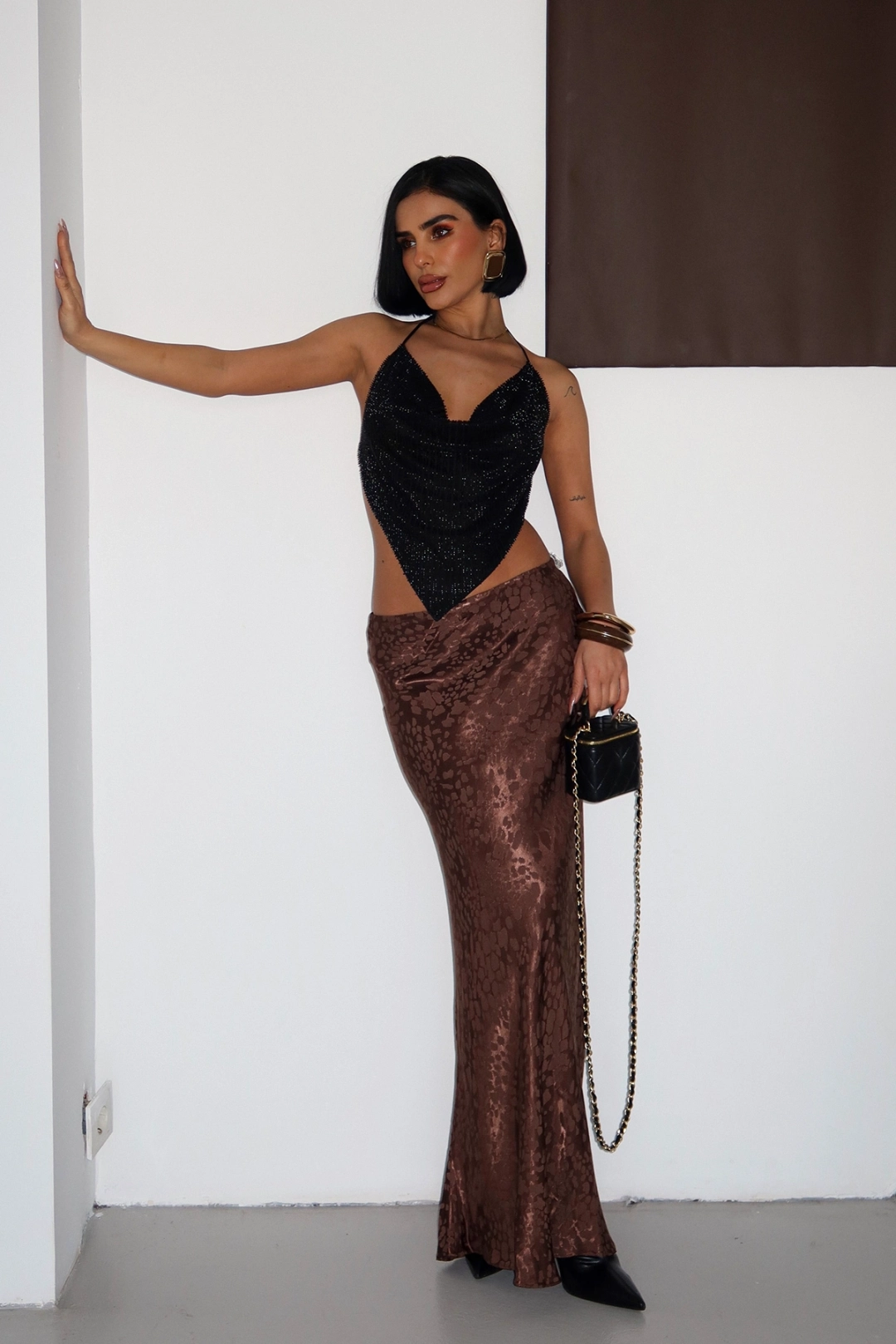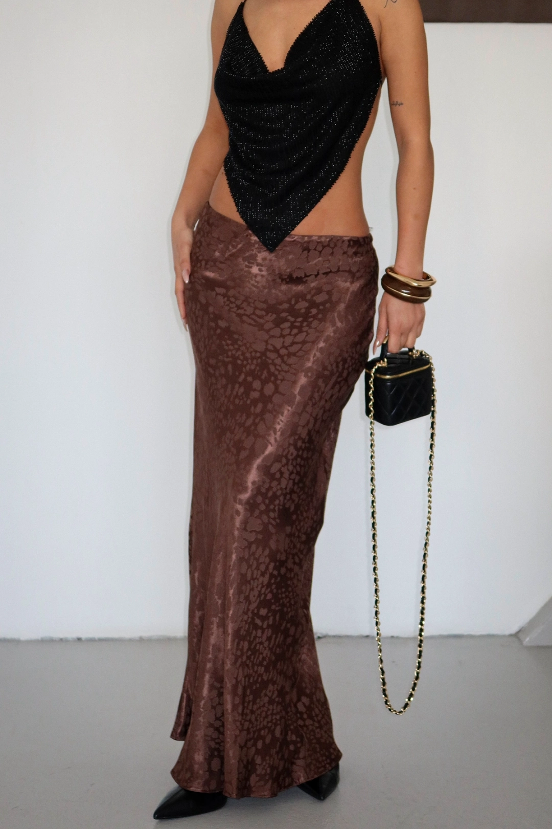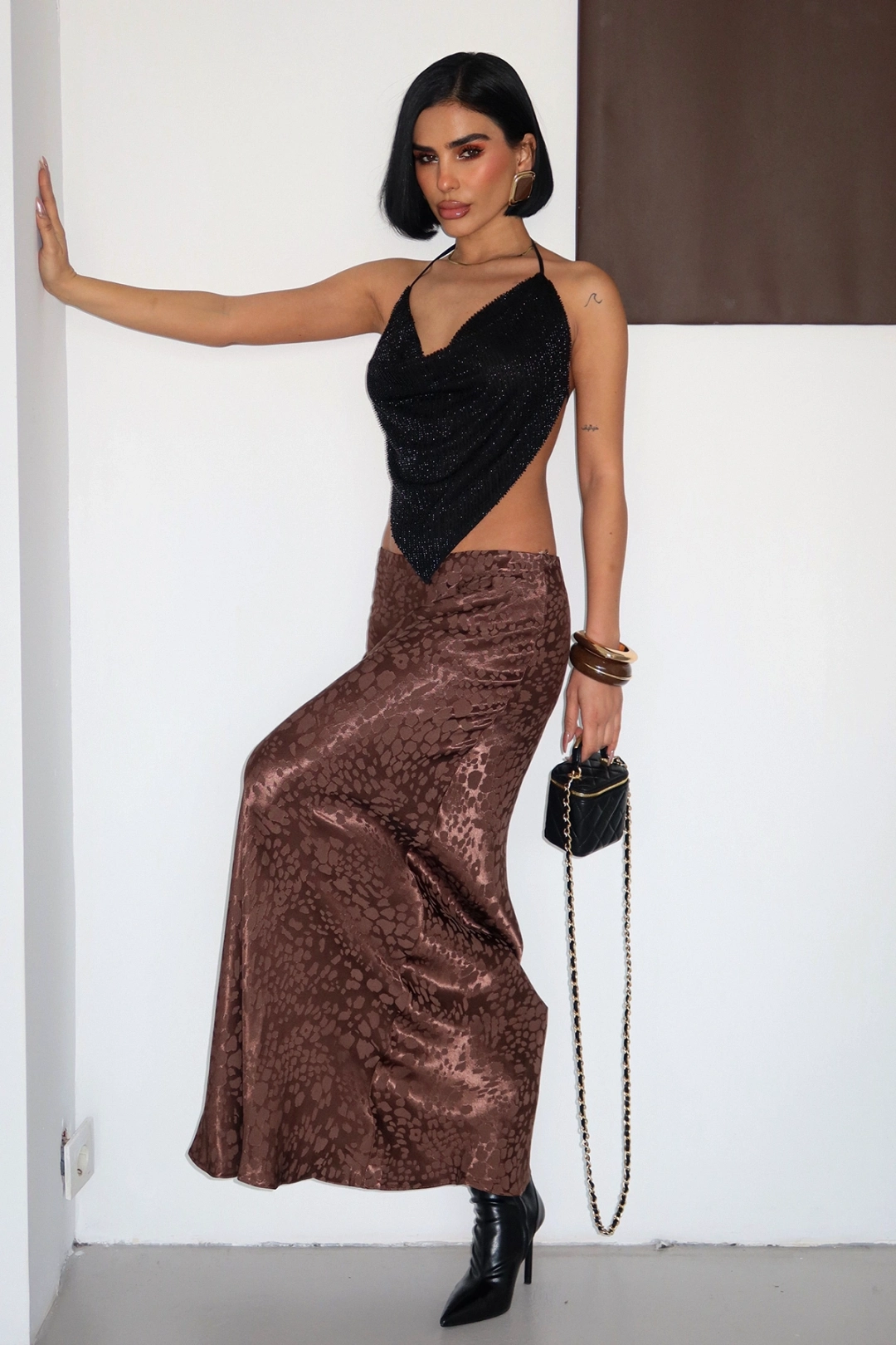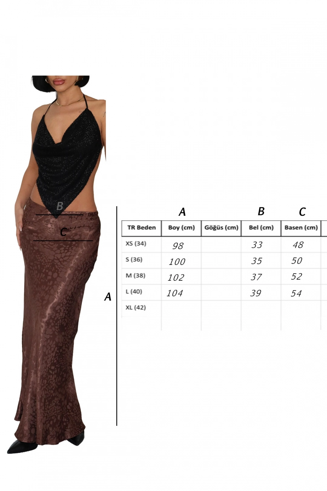 VİSKALİ markasının özel tasarımı olan Flok Baskılı Midi Boy Saten Koyu Kahverengi Etek, şıklığı ve rahatlığı bir arada sunar.