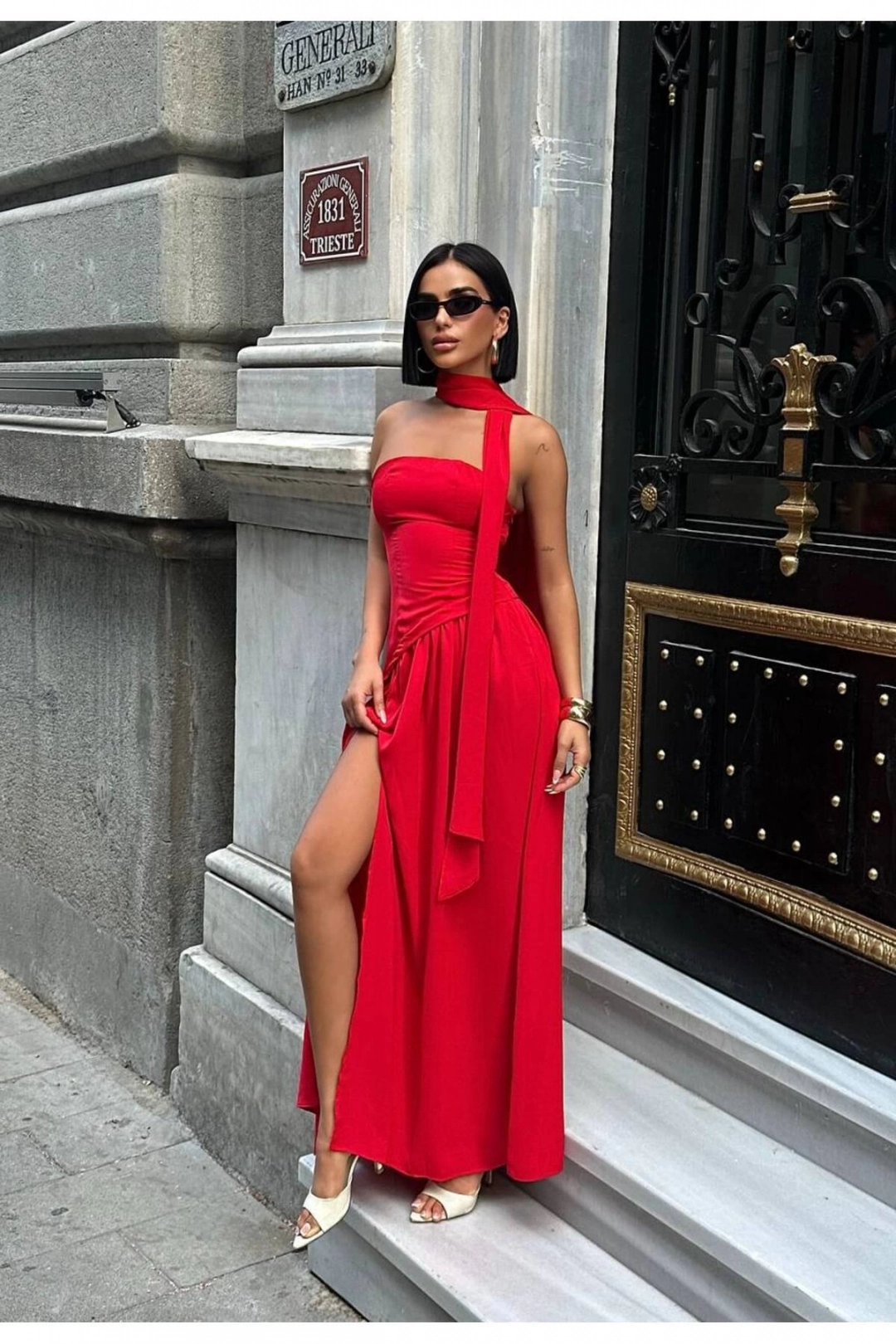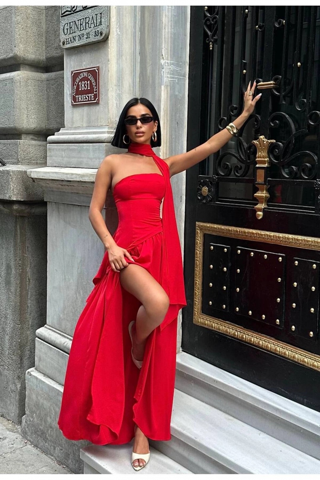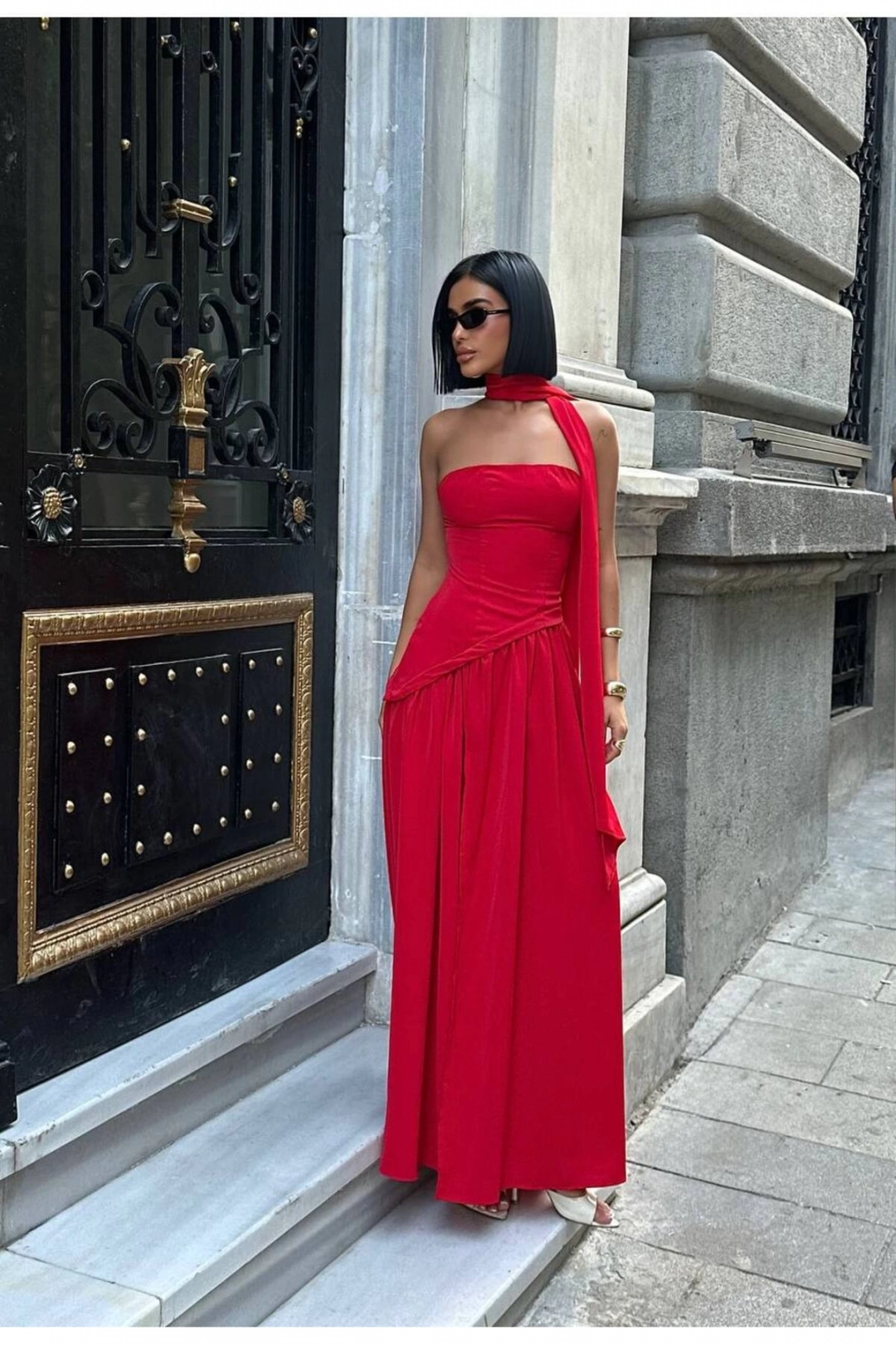 Göz alıcı kırmızı rengi ve zarif detaylarıyla öne çıkan bu maxi elbise, özel davetler ve gece şıklığı için mükemmel bir seçenektir. Straplez formu feminen bir duruş sunarken, kuşak detayı bel hattını vurgular ve kusursuz bir siluet yaratır. Yüksek yırtmaç detayı ise modern ve iddialı bir hava katar. Minimal aksesuarlar ve topuklu ayakkabılarla kombinlendiğinde sofistike bir tarz elde edilir.