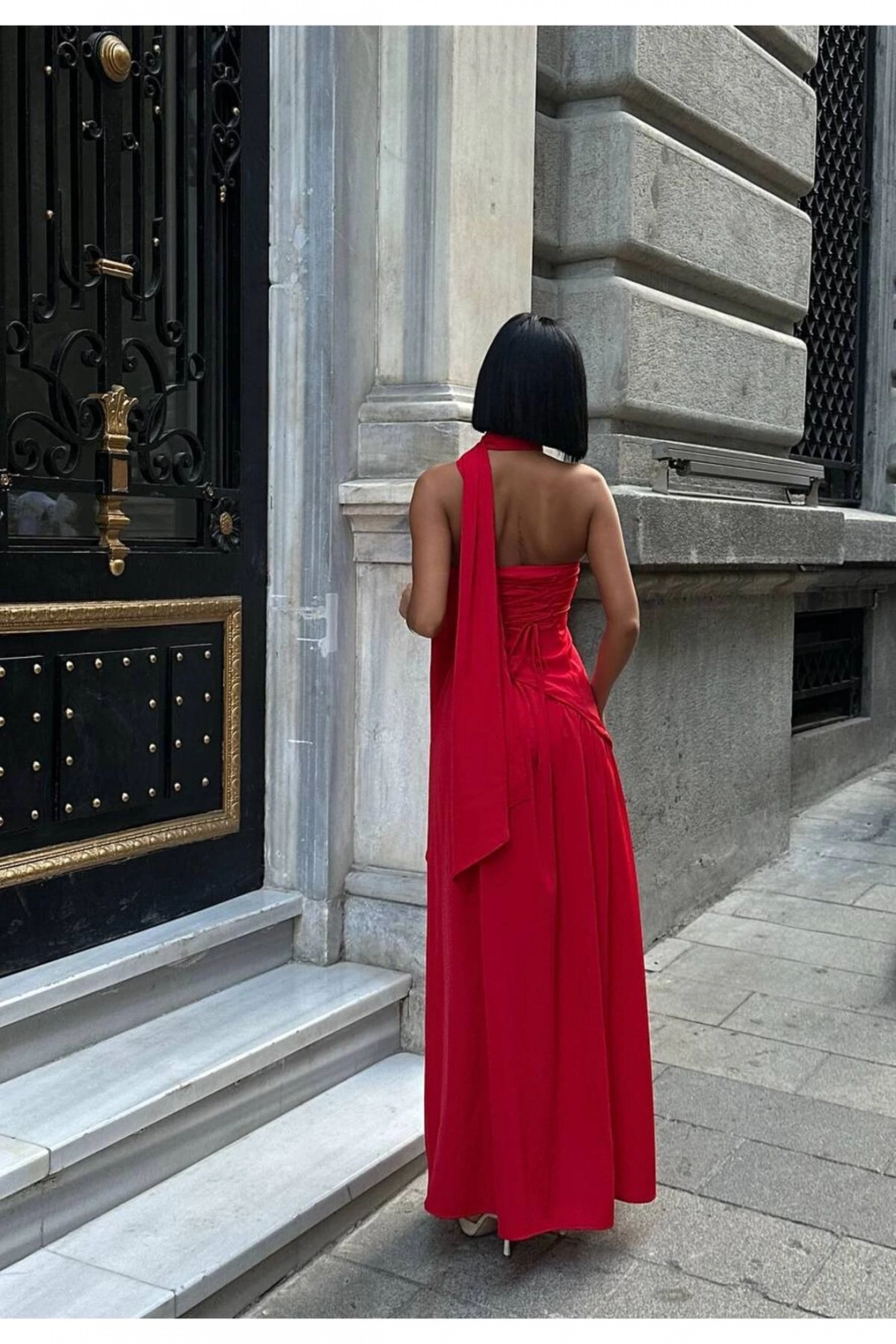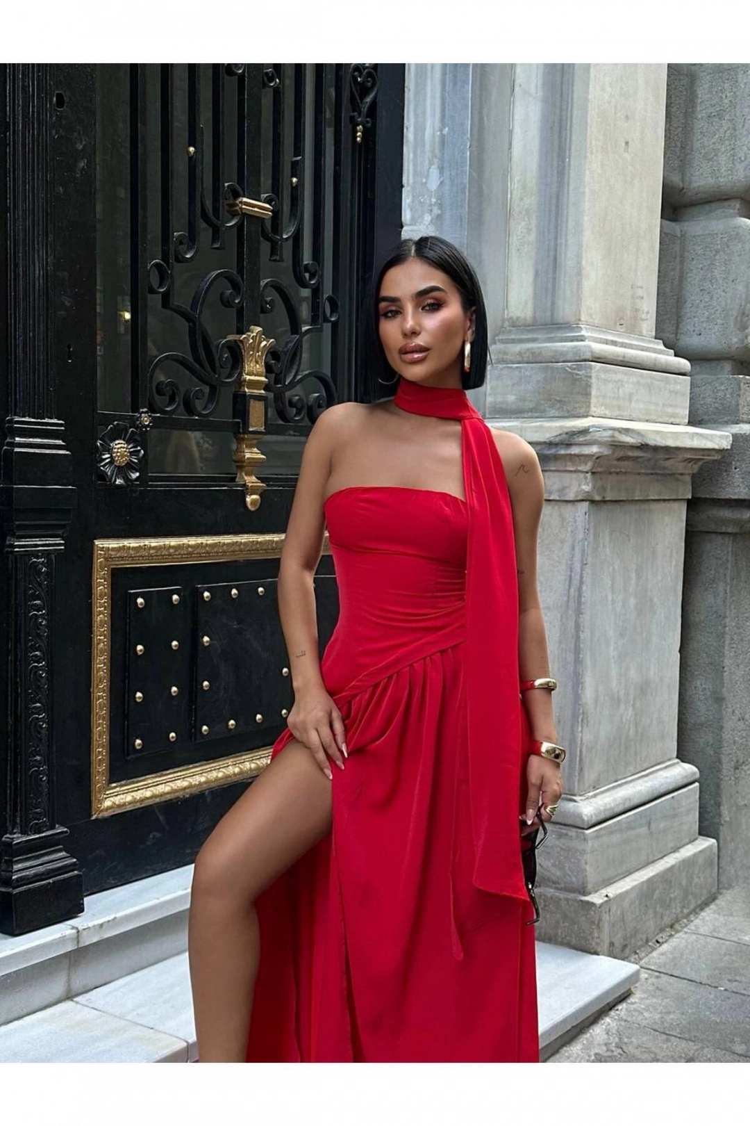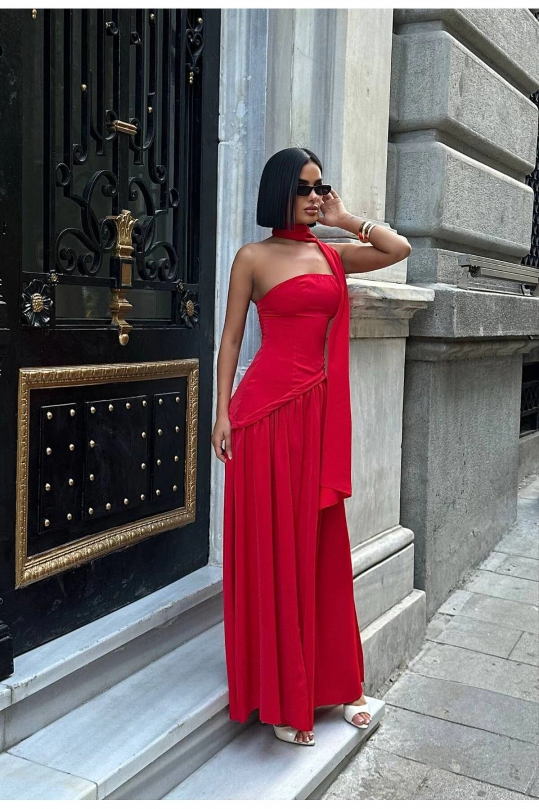 Göz alıcı kırmızı rengi ve zarif detaylarıyla öne çıkan bu maxi elbise, özel davetler ve gece şıklığı için mükemmel bir seçenektir. Straplez formu feminen bir duruş sunarken, kuşak detayı bel hattını vurgular ve kusursuz bir siluet yaratır. Yüksek yırtmaç detayı ise modern ve iddialı bir hava katar. Minimal aksesuarlar ve topuklu ayakkabılarla kombinlendiğinde sofistike bir tarz elde edilir.