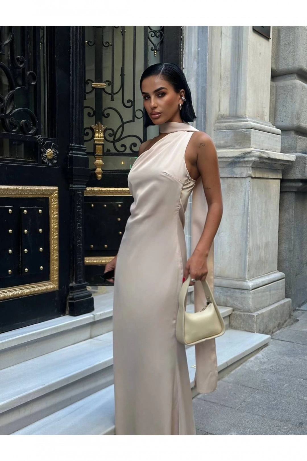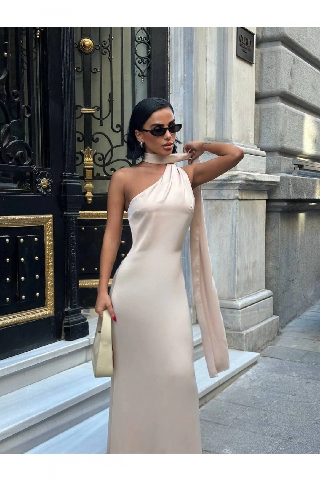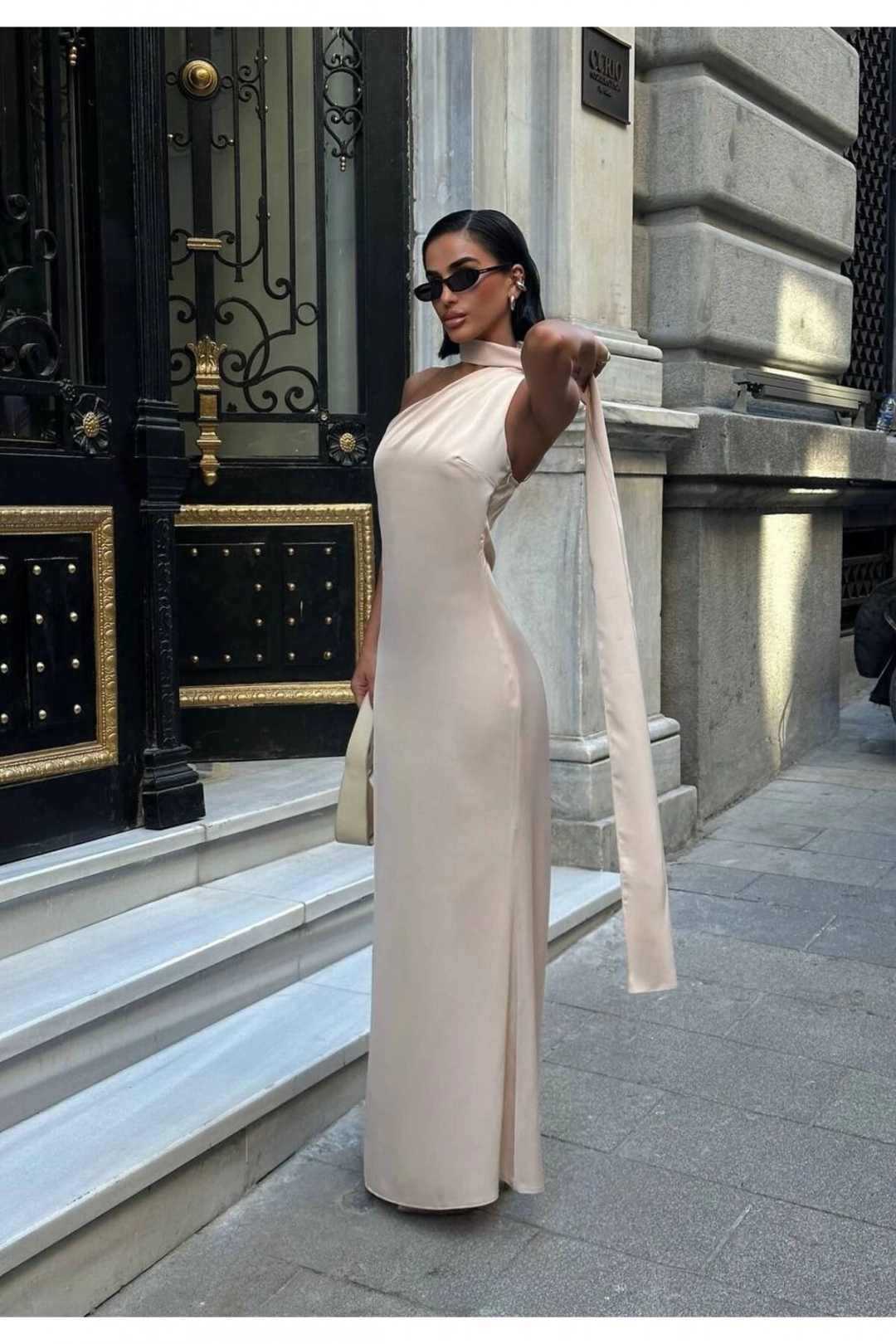 Tek omuz tasarımı ile dikkat çeken, zarif ve feminen bir siluet sunar.
