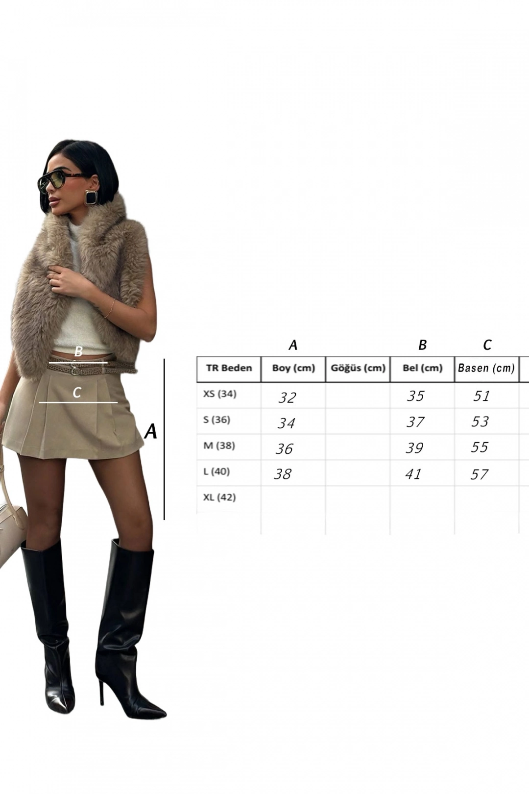 VİSKALİ Pileli Kemer Detaylı Şortlu Basic Bej Etek, şıklık ve rahatlığı bir arada sunuyor.
